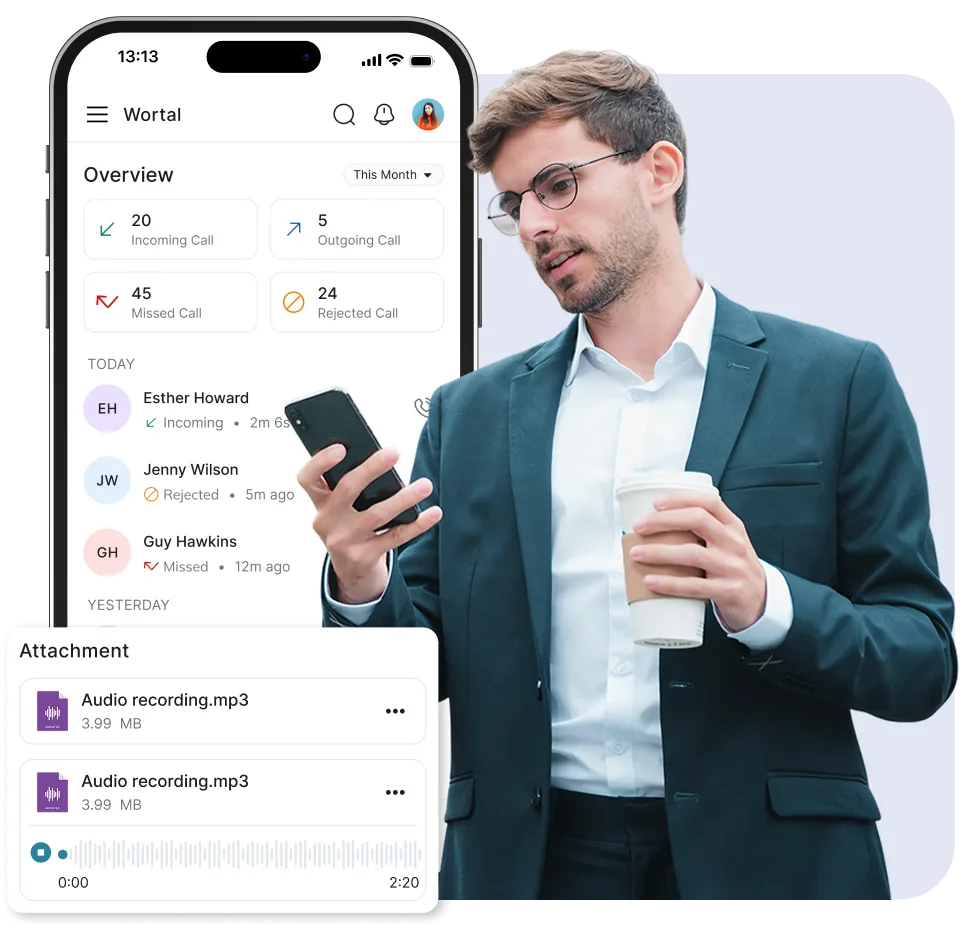 Make and receive calls from your phone and have every call auto-logged to the right lead with time, duration, and recording in Wortal CRM. No need to pay additional charges for call recordings, get call summaries of each call (Recording depends on device support)